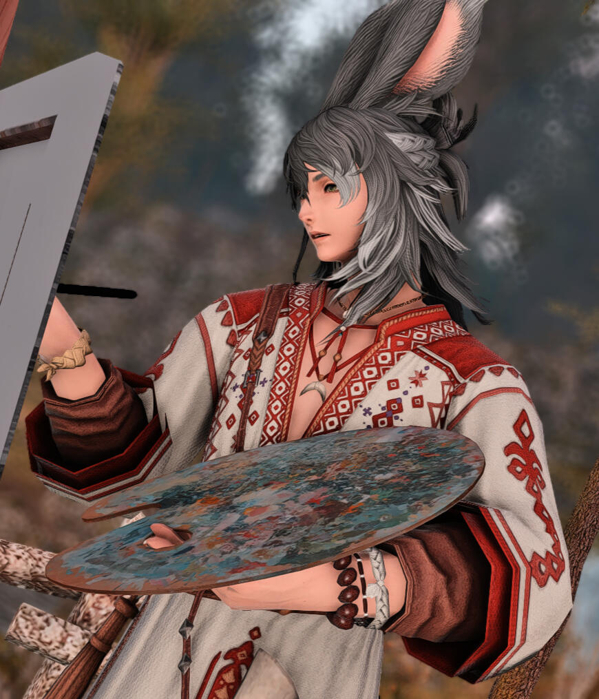 Born in the snow mountains of the Skatay Range, Basil grew up in a small village of Viera and was once coddled as the crybaby that liked painting until age revealed him to be a male Viera, and he would be brought out for the customary ward training men would undertake. The abnormally clumsy, unlucky and prone to danger Viera was somehow able to make it through this training despite the whispering of the villagers that were certain he wouldn't survive.After training Basil realized he couldn't fit within the role he was meant to fulfill so he chose to leave the village, his old name, and everything he knew.Basil now wanders Etheirys alone, painting the scenery as he travels as painting was what he had cherished most since he was young.As a traveler Basil often offers help where he can in exchange for a bit of gil or a place to sleep.